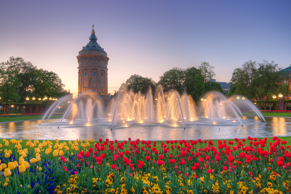 Mannheims Wahrzeichen, der alte Wasserturm am Friedrichsplatz. Beleuchtet vom letzten Licht des Tages bietet sich ein atemberaubendes Schauspiel aus Wasser, Licht und Farben.