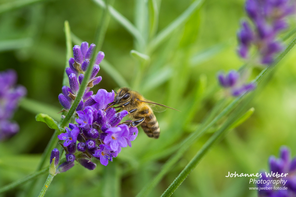 Nicht nur im Frühling haben die Bienen viel zutun, auch im Sommer blühen auf den Wiesen und im Garten verschiedenste Blumen und Sträucher. Hier saugt die Biene in mühevoller Arbeit den Nektar aus den einzelnen Blüten des Lavendelstrauchs.