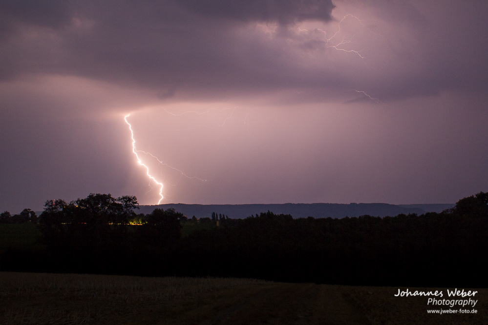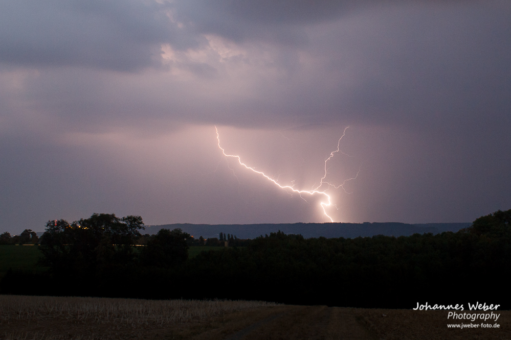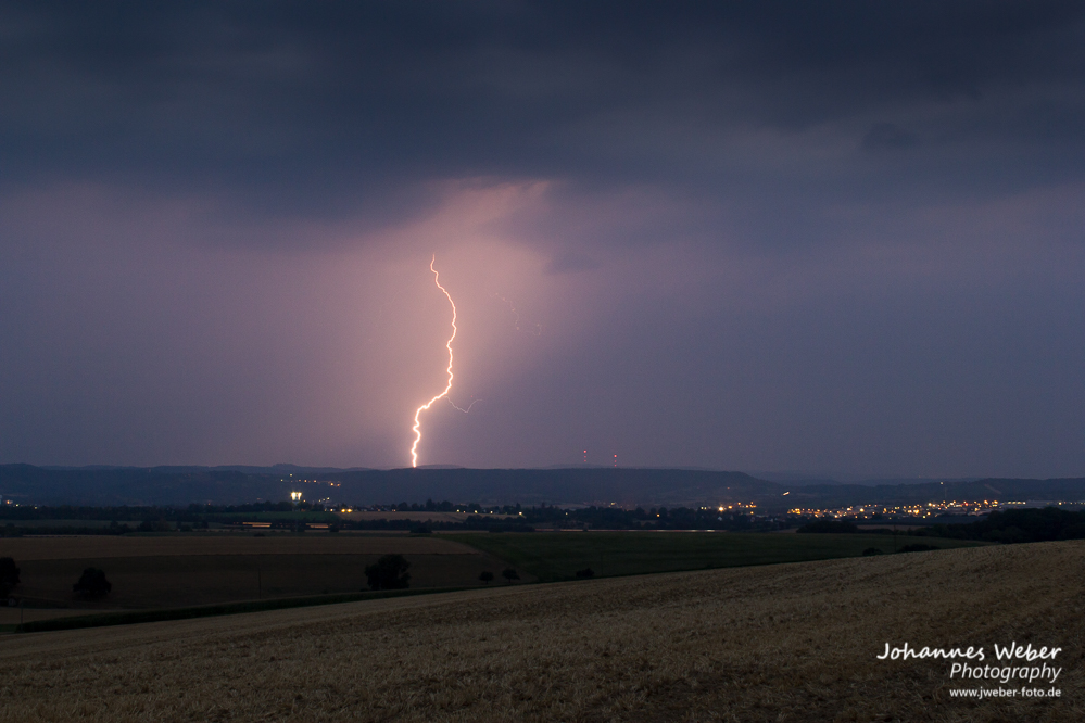 Das drückend schwüle Wetter am Sonntag entlud sich am frühen Abend in heftigen Gewittern über ganz Süddeutschland. Statt dem Abschlussfeuerwerk des Unterländer Volksfests wurden so als seit langem mal wieder Blitze festgehalten. Der Standort in der Nähe von Friedrichsruhe war perfekt – das Gewitter zog über Waldenburg kommend Richtung Heilbronn durch.