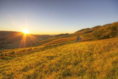 Die Weinberge entlang des Brettachtals zwischen Geddelsbach und Adolzfurt sind in herbstliche Rottöne gefärbt und das abendliche Sonnenlicht tut sein...